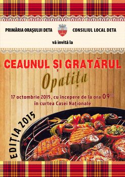 | PRIMĂRIA ORAŞULUI DETA şi CONSILIUL LOCAL AL ORAŞULUI DETA vă invită în data de 17 octombrie 2015, începând cu ora 900, la Festivalul de gătit CEAUNUL şi GRĂTARUL OPATIŢA, ediţia 2015, care va avea loc în curtea Casei Nationale din Opatita. |