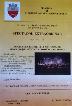 PRIMARIA ORASULUI DETA si CONSILIUL LOCAL AL ORASULUI DETA organizeaza sambata 13 decembrie 2014, orele 19 la Centrul Cultural, un spectacol extraordinar sustinut de ORCHESTRA CONSILIULUI NATIONAL AL MINORITATII NATIONALE ROMANE DIN SERBIA.