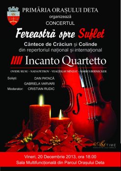 PRIMARIA ORASULUI DETA organizeaza vineri 20 decembrie 2013, orele 18 la Sala multifunctionala din Parcul orasului, concertul Fereastra spre Suflet, Cantece de Craciun si Colinde din repertoriul national si international prezentat de INCANTO QUARTETTO. http://www.incanto-quartetto.eu/inregistrari1.php |