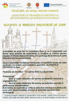 In perioada 1-3 aprilie 2010 in orasul Deta, in cadrul proiectului “Sezatori cu traditii si noutati la Deta (Romania) si Bordany (Ungaria)” va avea loc activitatea Educatie si traditie religioasa la Deta. Aceasta activitate va fi organizata sub forma unui schimb de experienta si invatare la nivelul elevilor claselor V-VIII din Deta si Bordany, la care vor participa 45 de elevi si 5 cadre didactice din fiecare localitate. Scopul activitatii este invatarea obiceiurilor si traditiilor locale de catre parteneri, cu ocazia unei sarbatori specifice, de PASTELE ORTODOX la Deta. |