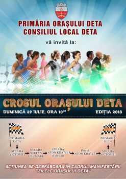 Primaria orasului Deta si Consiliul Local Deta va invita sa participati la CROSUL ORASULUI DETA, Editia 2018, duminica 29 iulie a.c., incepand cu orele 1000. Crosul va fi organizat pe categorii de varsta (7-14; 14-20; 20-40; peste 40 ani), atat la masculin cat si la feminin.